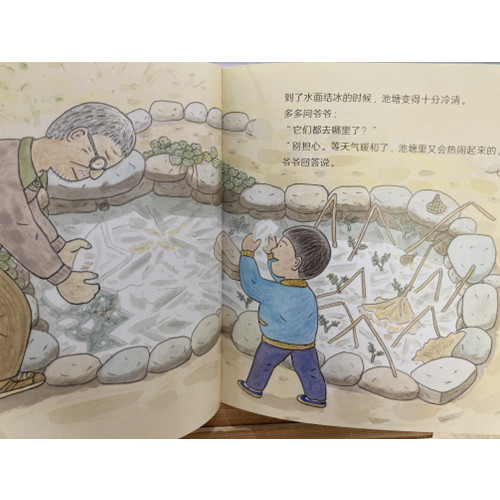 有一天爷爷说:“我想在院子里造这样一个池塘。”“嗯,太好了!”多多回答。多多和爷爷造了一个什么样的池塘呢