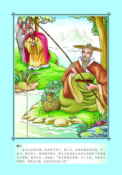 姜太公没有白等,机会终于来了。第二天,他早早地来到河边,不一会儿,他听到了一阵马蹄声传来。周文王姬昌在几名护卫的保护下来到姜太公面前,施过礼后,对他说:“我总算找到您啦,占卜(指用龟壳来推断未来的吉凶祸福的迷信手法,古代人做事之前都会先占卜)上说,当有圣人到周时,周就会兴盛,您就是那位圣人啊!”