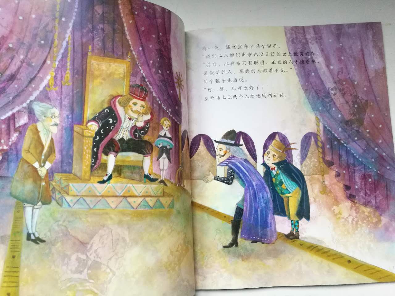爱慕虚荣的皇帝喜欢穿着华丽的新衣招摇过市。两个骗子说会给皇帝用只有聪明人才能看得见的神奇布料给皇帝制作新衣。全国的人们都假装看得见皇帝的新衣,只有一个孩子说出了真话。