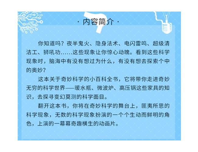 本书是关于科学知识的小百科全书,将带你领略奇妙无穷的科学现象。翻开这本书,你将看到多姿多彩的科学世界,夜半鬼火、隐身法术、电闪雷鸣、超级清洁工、狮吼功……这些现象让你惊心动魄。这些令人匪夷所思的科学现象为小朋友们上演了一部精彩而神奇的科教片。