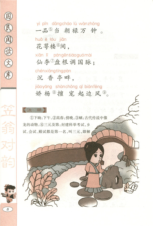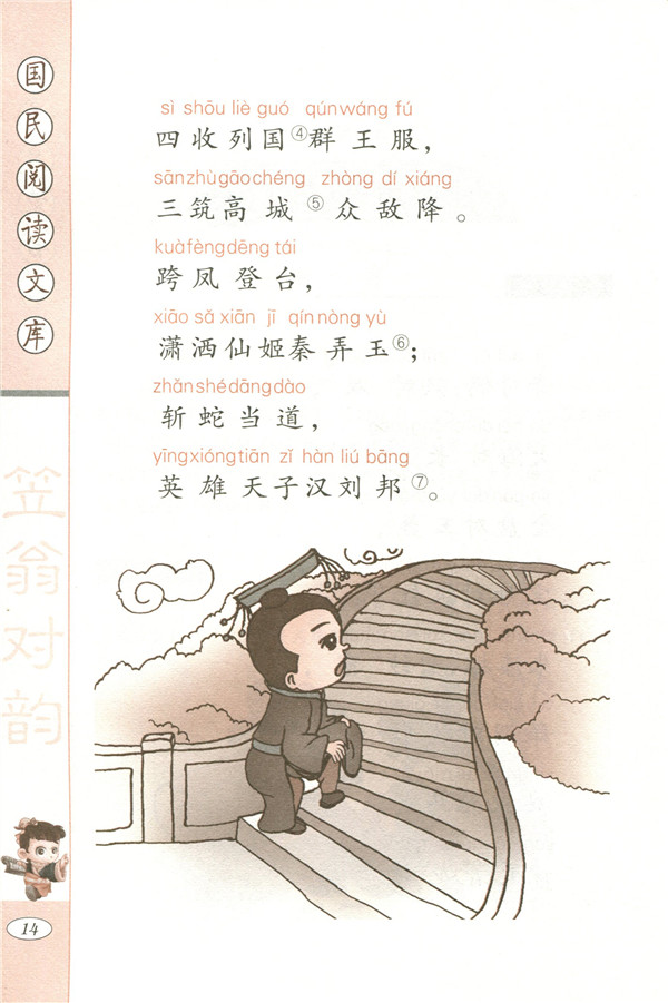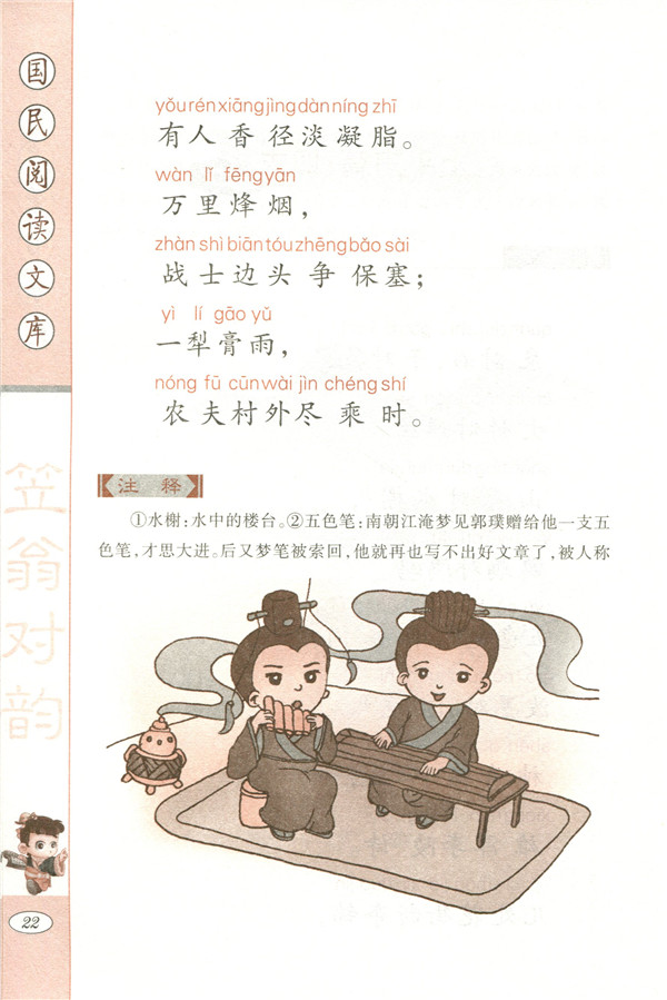 国学门类繁多,内容丰富,思想深刻,体现了中华民族特有的气度和精神。通过阅读国学,能使孩子从中汲取思想的力量,对孩子语言能力的开发和良好品质的形成都具有重要意义。鉴于此,我们策划编撰了《国民阅读文库*国学启蒙书系列》丛书,进而引导青少年走近国学,培养青少年朴素的道德观。为了向青少年深入浅出地渗透国学精髓,本丛书精选的均为国学中的经典读物,包括《唐诗》《宋词》《论语》《诗经》《三字经》《百家姓》《千字文》《千家诗》《山海经》《弟子规》《道德经》《增广贤文》《小窗幽记》《幼学琼林》《声律启蒙》《围炉夜话》《笠翁对韵》《孙子兵法》《三十六计》《大学?中庸》20本。在策划过程中,我们采用活泼插图的表现方式,编选相关的精彩故事,融知识性与趣味性于一体,让青少年在诵读中轻松快乐地亲近国学,更直观、真切地感受国学的魅力,在阅读中积淀文化底蕴,培养良好道德品质,从而受益一生。