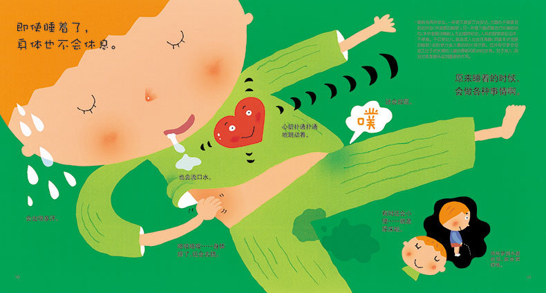 处于生长发育期的孩子往往会对自己的身体充满好奇,为什么要刷牙,为什么会拉便便,为什么摔伤了会流血,为什么会感冒,为什么要吃新鲜蔬菜,等等。如何让幼小的孩子明白这些问题,绘本以富有童趣的故事和简洁呆萌的画面做了完美解答。该套书共有8册:《牙齿的故事》《便便》《睡觉啦》《别输给感冒啊》《神奇的感觉》《身体里出的东西》《很好吃的》《骨头君》。每册一个主题,例如,《牙齿的故事》中,绘本讲述两位70岁高龄的爷爷和奶奶:爷爷因为小时候各种不良习惯,所以造成老年牙齿全脱,只有靠戴假牙吃东西;奶奶却是从小爱护齿,定时去看牙医,一口牙齿白又亮,吃什么都香。绘本让孩子们在了解自己身体的同时,理解良好生活习惯的重要性,从而自觉改掉一些坏习惯。绘本体贴入微地讲述了各种好习惯的生活细节,是2—6岁小朋友的健康必备书。