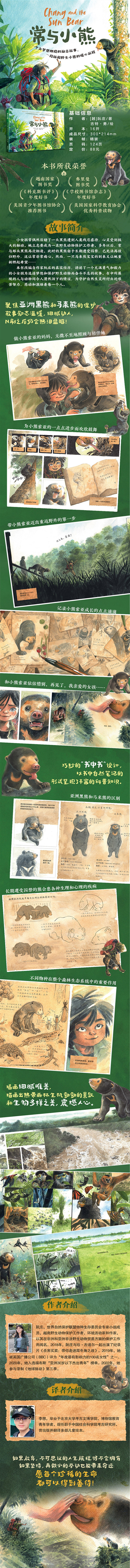 《常与小熊》改编自作者阮庄的真实经历。阮庄是世界自然保护联盟熊科组专家,被评为“BBC年度百位影响力女性”之一,曾入选福布斯“亚洲30岁以下杰出青年”榜单。2018年,阮庄与珍•古道尔一起出演了纪录片《杀害买卖:带你走进犀牛角之战》。2022年,她参与录制了《地球脉动》第三季。 本书已获得越南国家图书奖、《科克斯书评》年度好书、《学校图书馆杂志》年度好书、美国国家科学教育协会优秀科普读物、美国防止虐待动物协会动物行为协会杰出图书奖、 “漫画界奥斯卡奖”艾斯纳荣誉奖、弗里曼图书奖、美国全国科学教学协会优秀科学行业图书、美国青少年图书馆协会选书;并入围2023年yoto卡耐基插画奖短名单。