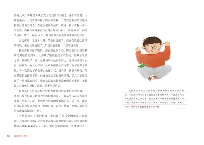 面对孩子,作者则呈现出无限宽容与温情的一面,始终与面临成长难题的孩子站在一起。在陪孩子写作业成为焦点话题的今天,读到下面的文字不由令人心头一热:“整个一年级,只要我在家,就陪伴菜虫,直到他作业写完。菜虫的书桌前是并排放两把椅子的,他坐一把,我坐一把。我不在,则换虫妈。这里也需要说明一下,陪伴的目的不是监督,陪伴是共同承担,不论快乐还是困难。”不去责难孩子,接纳孩子的感受,与孩子共情,耐心等待孩子的成长,看到孩子的每一点进步,这既是一位父亲的温柔深情,也体现了他对孩子成长规律与教育本质的深刻理解。