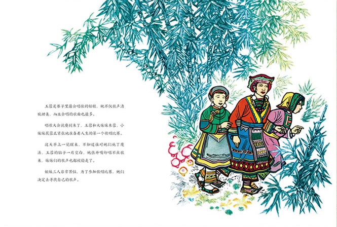 以充满浓郁民族风情的木刻版画形式, 讲述了一个流传在我国广西的民间故事:三个好姐妹因为比赛输了山歌,从而寻找具有神力的画眉泉,但在寻找的过程中,由于三人的性格不同,行为不同,最后结局大相径庭。