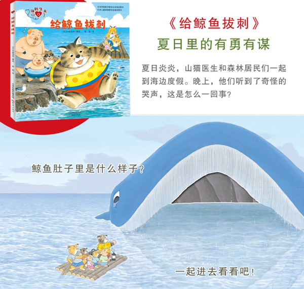 “山猫医生来了”系列图书既讲述了有趣的故事,让小读者在故事中可以认知动物、提高情商、养成良好的生活习惯,又通过翻翻、洞洞等工艺增加了图书互动性,是一套融入猜想、思考的互动式启蒙读物。 《给鲸鱼拔刺》:夏日炎炎,山猫医生和森林居民们一起到海边度假。晚上,他们听到了奇怪的哭声,这是怎么一回事?