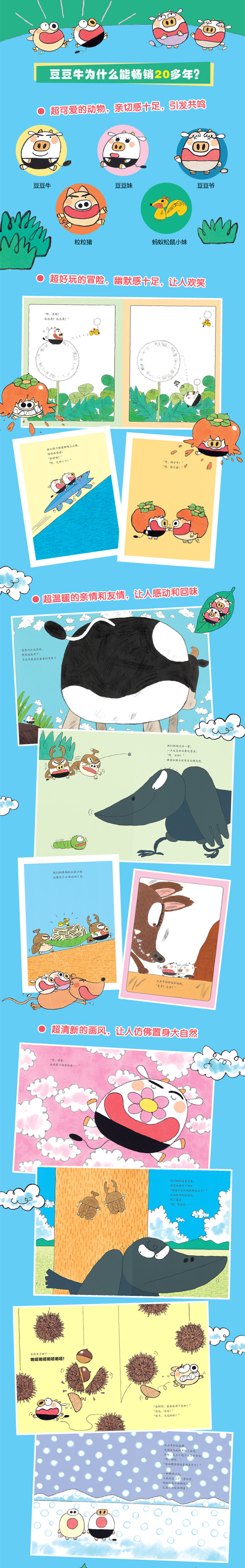 《“每天都是大冒险”豆豆牛成长绘本》这套书一共13本,讲述了豆粒一样大的豆豆牛的幸福生活。《豆豆牛》介绍了豆豆牛是谁,他如何喜欢冒险、如何热爱生活。《豆豆牛的爸爸》《豆豆牛的妈妈》《豆豆牛和豆豆妹》《豆豆牛和豆豆爷》《豆豆牛和豆豆奶》介绍了豆豆牛幸福的一家,教孩子认识家人的爱,增强幸福力和责任感。《豆豆牛和粒粒猪》《豆豆牛和蚂蚁松鼠小妹》讲述了豆豆牛的两个好朋友,教孩子珍惜友谊,认知自我。《豆豆牛的粉红色的春天》《豆豆牛的炎热的夏天》《豆豆牛的吃惊的秋天》《豆豆牛的圆溜溜的冬天》讲述了豆豆牛经历的一年四季,让孩子热爱自然,习得耐心和观察力。《豆豆牛的圣诞节》讲述了大家的愿望,豆豆牛的愿望则是“要大家的愿望全部实现!”