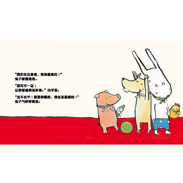 “哎哎哎,我的球!没关系——我很高哦!”“你好,小兔子。我们一起玩好吗?”小鸡问……