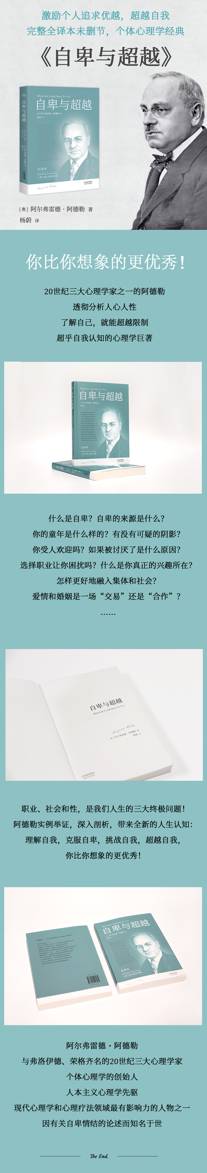 阿德勒说:“一切人类文明都是基于自卑感而发展起来的。”这本阿尔弗雷德·阿德勒著杨蔚译的《自卑与超越(全译本)》告诉我们:每个人生来就背负三大任务,人生所要面对的问题都因它们而起,平衡职业、社会和性的关系,才能获得长远的发展,挖掘真正的兴趣所在,是解决职业问题的专享方法,用对别人有利的行为来获取感情和尊敬,能更好地融入集体和社会,爱情和婚姻并非“交易”,而是为人生幸福建立的一种合作,推测童年记忆,就能找到自卑感的来源和性格形成的真相,每个人都有自卑感,克服自卑感是我们成长的原动力,只有克服自卑感的人,才能在碰壁后及时调整方向,人生的三大问题总是在寻求更加丰富完美的解决方案,人类也在挑战的过程中更好地理解和超越自我。