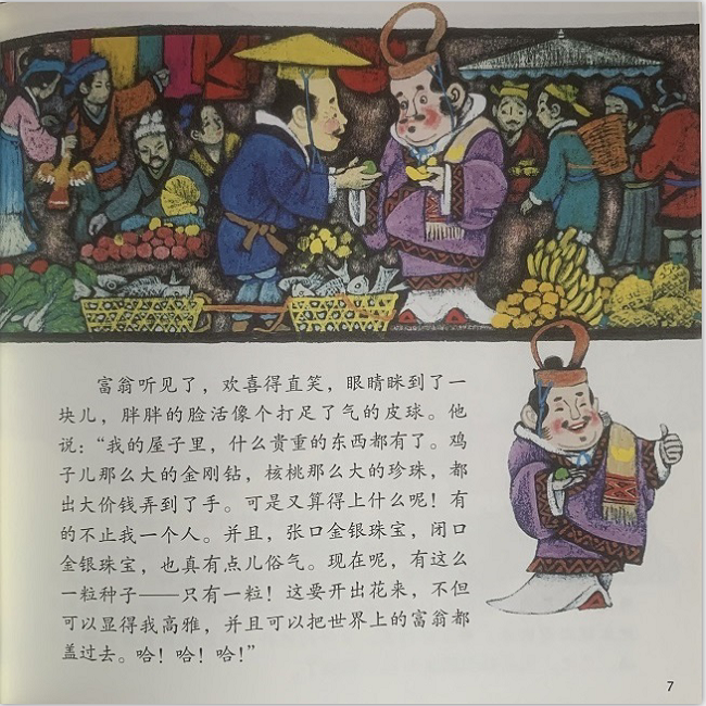 故事讲述了国王得了一粒神奇的种子,他把这粒世界上独一无二的种子种白玉盆里,每天看了又看,还把盆移来移去,生怕种子长不出芽。两年以后种子一点儿动静也没有,国王生气地把种子扔了。富翁得到了这粒种子,找了四个花匠来培育它。两年过去了,富翁扔掉了没有任何变化的种子。种子又落到了商人手里,一年以后商人扔掉了没有发芽的种子。种子又以被守军营的兵士拾到了,一直以后,兵士生气地扔掉了没有发芽的种子。后来,种子落到的种田的农夫旁边,他把种子种在麦田里,和种庄稼一样。没几天种子就发芽、开花,长出了一棵开放着异常美丽的花、浓郁香味的小树。国王、富翁、商人和兵士得到种子的时候,都想着让它发芽、开花,显示出他们的权力、富足,带来财运和官运,只有农夫没有任何想法,所以这粒神奇的种子没有在国王的白玉盆里发芽,却生长在了普通的农田里。 第二个故事是《一幅壮锦》,这个民间传说责编小时候好像看过同题材的动画片,看来是非常有名的少数民族故事。有三个儿子的老阿妈是一个心灵手巧的人,她会织漂亮精美的壮锦。她在赶集的时候看上了一幅美丽的画,画里有山村、田园、竹楼和小桥……老阿妈用所有卖锦的钱,买下了这幅画,回家照图织锦,用了三