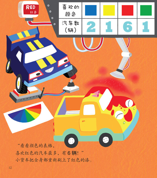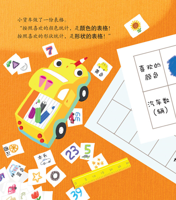 王牌汽车大会就要举行了!小货车很想成为大家最喜欢的汽车,于是,它做了很多调查统计:大家最喜欢的是什么颜色?大家最喜欢什么类型的轮胎?大家最喜欢的数字是什么?最后,小货车被选为王牌汽车了吗?