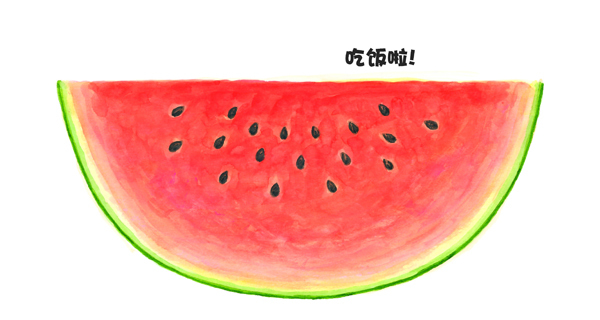 吃饭啦!好大一个西瓜,吧唧吧唧吃完了。是谁吃的呢?是小猪呀。小猪吃饱了。