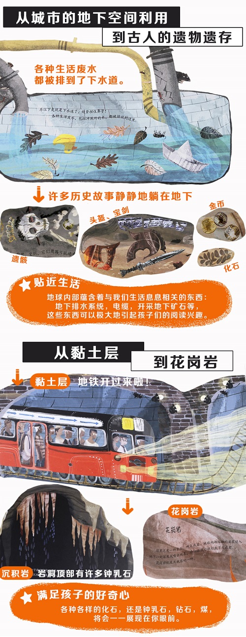 ★贴近生活:地球内部蕴含着与我们生活息息相关的东西:地下排水系统,电缆,开采地下矿石等,这些东西可以极大地引起孩子们的阅读兴趣。