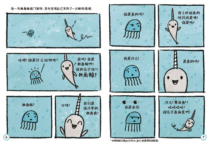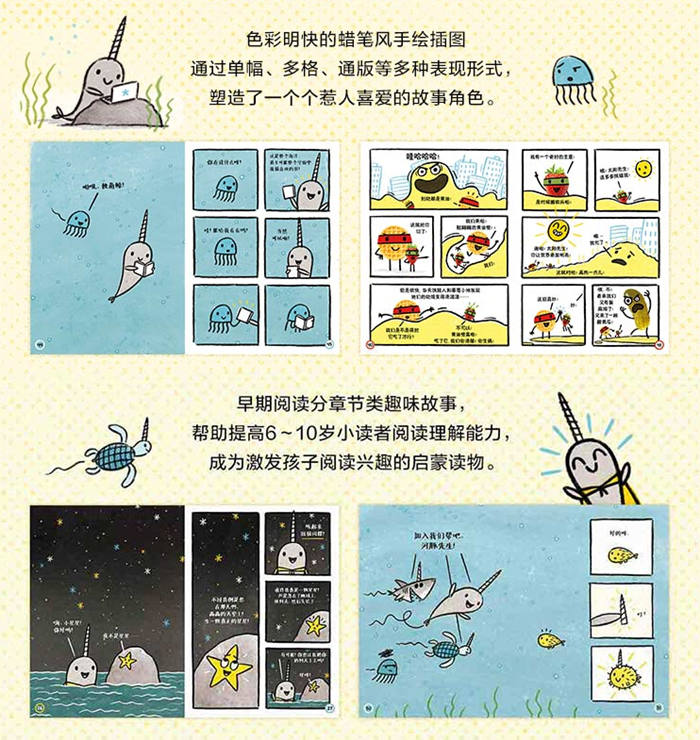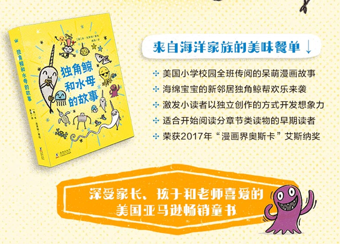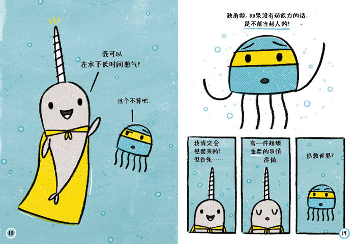 《海洋超人组合》:主人公独角鲸和水母在本书的三个故事中,开启了超级英雄的海洋冒险。在*个故事中,独角鲸展示了自己想象中的超级英雄潜质,然而他自己的超能力究竟是什么?在水母的帮助下帮终于得偿所愿;第二个故事讲述独角鲸如何用他的超能力帮助朋友实现当“真正的”星星的愿望;在第三个故事中,水母因为被嘲笑感到很忧伤,独角鲸火速赶来,以出人意料的方式“伸张正义”。