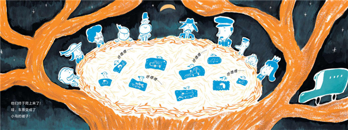 但是车票呢?大家还是要继续追啊!乘客们休息之后,翻过了雪山,终于找到了车票的下落 — 在高高的树上,车票成为了小鸟的被子!大家都不忍心将车票取回,于是悄悄溜下树,继续原本的行程。不过,司机回到家后,却亲手织了一些小被子,打算将那些车票换回来。