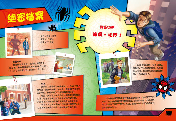 仅仅只有这些吗?当然不是!除了故事之外,还有更多的方式来传递这些宝贵的品质。在4—8岁这一年龄段,我们通过游戏环节的设置、自我评价的引导和趣味测试的带动,才能让好动爱玩的男孩们在获得快乐与智慧的同时,收获宝贵的品质。翻开这本书,男孩们通过“绝密档案”进入超级英雄的世界;在“新人加油站”完善读者个人信息,在巧妙的环节设置中挖掘自身优点,为自己加加油;紧接着,“蜘蛛侠放映厅”让男孩欣赏精彩故事,“大脑加油站”带领男孩玩游戏;“记忆力大冲关”则是以趣味测试题的方式带领男孩回顾故事情节,感受故事主角的心路历程;男孩还能在“创意竞技场”中根据step1、2、3的提示创造出一个新的反派或英雄,并发挥想象力,为这位新角色添加武器、服饰、秘密基地等关键信息。