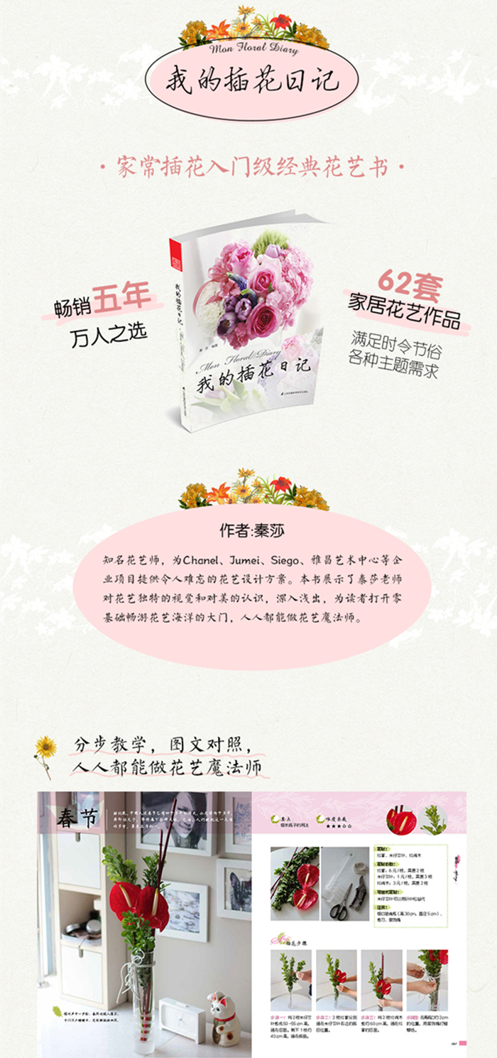 《我的插花日记》本书以时间为轴线,一年对应不同的季节和节日,每个新创意都能让读者萌生插花的念头,常见的花材和简单的操作让读者容易上手。分为节日花艺和日常插花。每个插花都配有详细的步骤讲解和图片。节日花艺会根据不同的季节选择当季花材,搭配节日的氛围,更好地烘托节日气氛。日常插花以简单装饰为主,应用形式多样,包括插花、浮花、手花等形式。