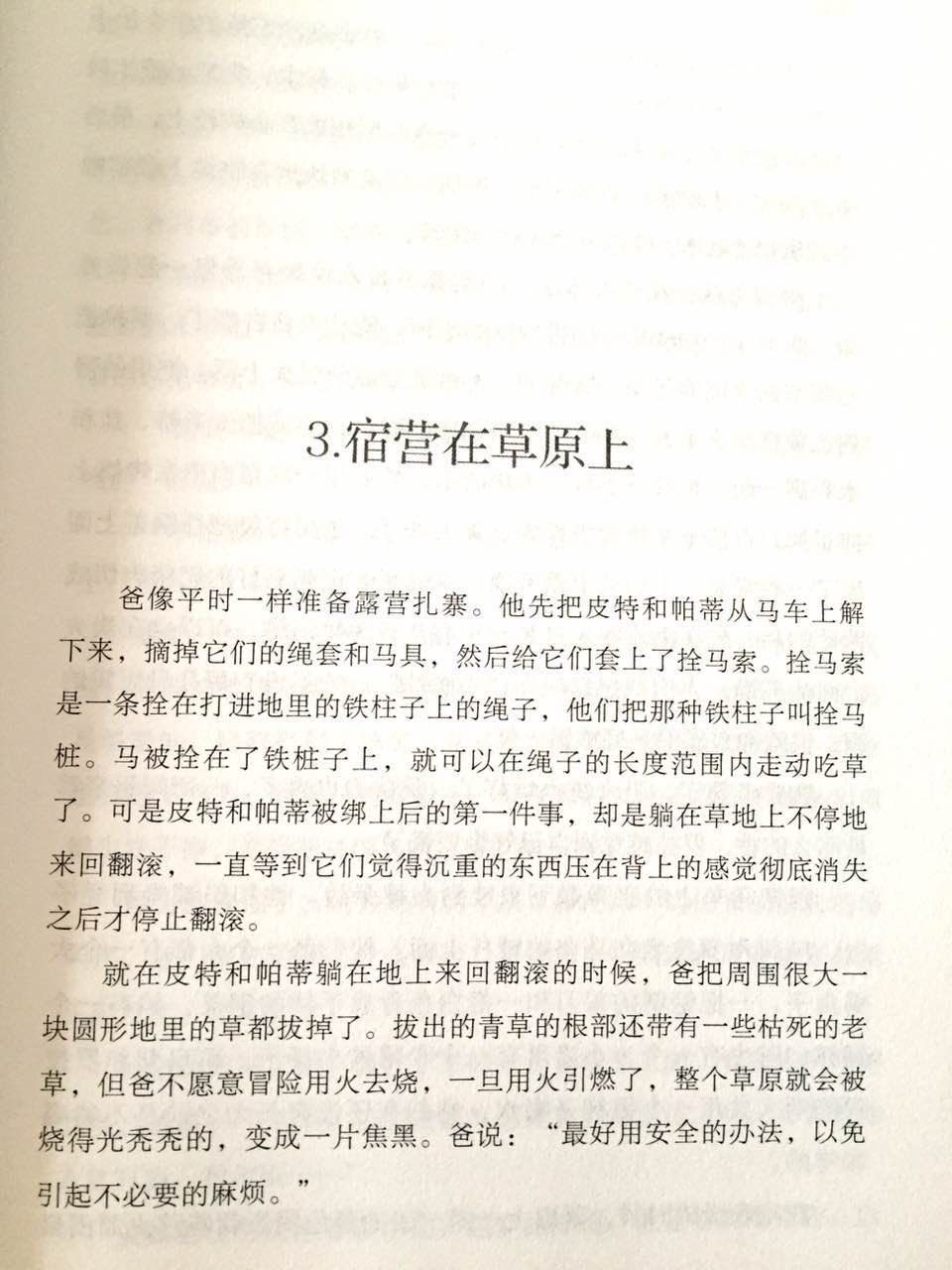 在他们吃晚饭的时候,草原变得更加黑暗和寂静了,只有风悄悄地在草丛中穿行,星星悬挂在广阔的天空中闪闪发光,看上去是那么低。在这片广袤的黑暗中,篝火给人的感觉是那样舒适。腌猪肉片又脆又肥美。玉米饼也很香。佩特和帕蒂嚼着草,咯吱作响。妈妈给了杰克一块玉米饼,杰克舔着,礼貌地摇着尾巴。