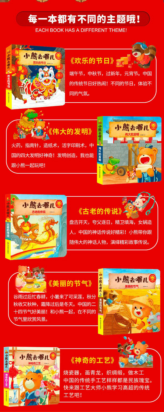 1.中国节!送给孩子的益智动物图画机关书:一群可爱的小动物,要去开展一场恢弘灿烂的中国文化体验之旅。搭配手动机关情节,拉一拉,转一转,推一推,玩一玩,锻炼孩子的动手能力和探索能力,让孩子和小熊一起快乐玩耍。