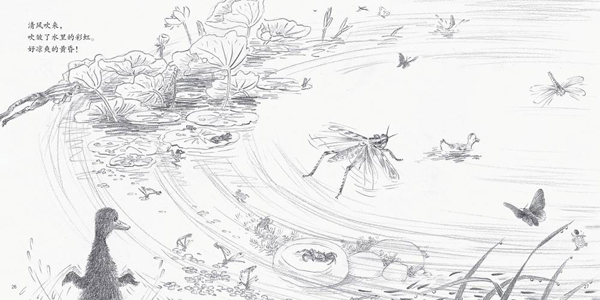 夏日的清晨,池塘被两只鸭子唤醒了,水边的虫子、青蛙,池下的鱼儿全都活跃起来,池塘热闹的一天开始了!作者通过鸭子的行进路线,轻松带出池塘边自然生灵们一天的生活。通过观察,孩子还能认识许多常见的水生植物。故事洗尽铅华,将知识点轻松隐藏于池塘的每一个角落。画面独特的绘画语言,将田园生活的一角表现得浪漫而富有朝气,也带给生于浮世的我们难得的心灵宁静。