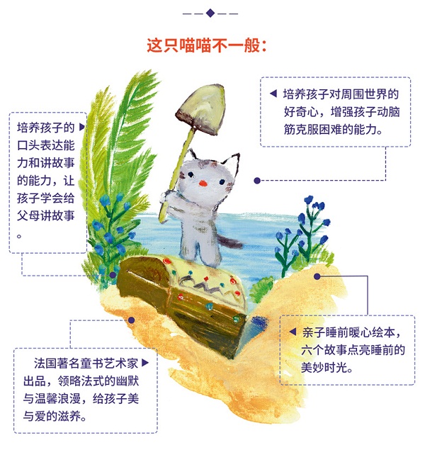书中喵喵给爸爸妈妈讲了当天他在幼儿园里发生的事,可是实际上我们知道这些都是喵喵自己在爸爸妈妈的提问下编出来的一个个小故事。虽然有些情节在我们看来是不现实的,但却充满了条理性,换句话说他可以自圆其说,比如,在《寻宝藏》一书中,喵喵说他发现了一个宝藏,爸爸说你今天不是上学吗?怎么有时间去挖宝藏?于是,喵喵说埋宝藏的小岛离学校很近,就在教室后面。接着爸爸又问他……