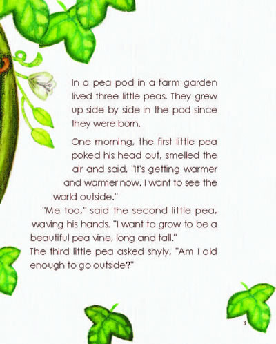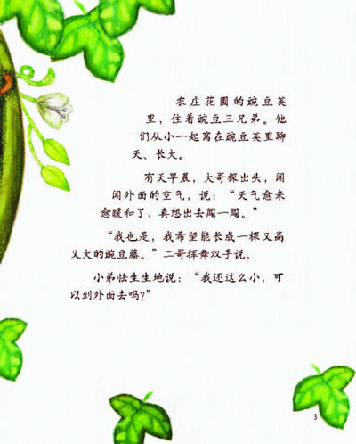 本书是新东方生命教育双语绘本“人己”系列中的一个小故事。农庄花圃的豌豆荚里,住着豌豆三兄弟,从小一起聊天,长大,转眼间到了该离开豆荚的时候,三兄弟分别迈向他们的前程,也分别遇到不同的困难。大哥卡在窗台上,出不来,二哥掉在河里,小弟落在玫瑰丛里。三兄弟用他们的智慧和勇气脱离困境,各自找到一个属于自己可以生长的地方。