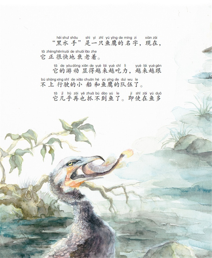 一只叫黑水手的鱼鹰,年少气盛,是个捕鱼行家。慢慢地它老了,但仍夜以继日地捕鱼,面对前来抢食的对手毫不退缩。后来,黑水手突然不见了,看鱼鹰的老爷爷和小男孩去找它,在河边发现它口中死死地咬着一条三十二斤的鱼!从那时起,黑水手的身体一天不如一天。老爷爷卖掉别的鱼鹰赚钱给黑水手买杂鱼吃。当黑水手的呼吸越来越急促时,老爷爷用酒把它灌醉,把它的身体埋葬在一个小土坑里。