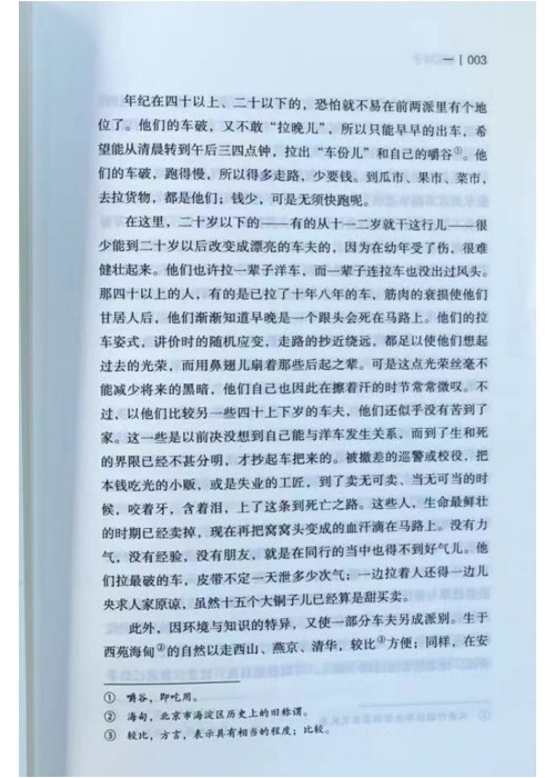 在这里,二十岁以下的--有的从十一二岁就干这行儿一-很少能到二十岁以后改变成漂亮的车夫的,因为在幼年受了伤,很难健壮起来。他们也许拉一辈子洋车,而一辈子连拉车也没出过风头。那四十以上的人,有的是已拉了十年八年的车,筋肉的衰损使他们甘居人后,他们渐渐知道早晚是一个跟头会死在马路上。他们的拉车姿式,讲价时的随机应变,走路的抄近绕远,都足以使他们想起过去的光荣,而用鼻翅儿扇着那些后起之辈。可是这点光荣丝毫不能减少将来的黑暗,他们自己也因此在擦着汗的时节常常微叹。不过,以他们比较另一些四十上下岁的车夫,他们还似乎没有苦到了家。这一些是以前决没想到自己能与洋车发生关系,而到了生和死的界限已经不甚分明,才抄起车把来的。被撤差的巡警或校役,把本钱吃光的小贩,或是失业的工匠,到了卖无可卖、当无可当的时候,咬着牙,含着泪,上了这条到死亡之路。这些人,生命最鲜壮的时期已经卖掉,现在再把窝窝头变成的血汗滴在马路上。没有力气,没有经验,没有朋友,就是在同行的当中也得不到好气儿。他们拉最破的车,皮带不定一天泄多少次气;一边拉着人还得一边儿央求人家原谅,虽然十五个大铜子儿已经算是甜买卖。