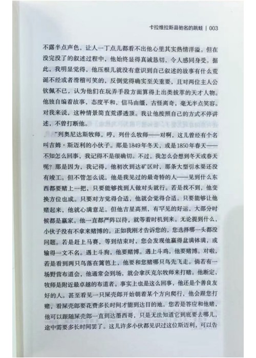 “列奥尼达斯牧师,哼,列什么牧师一一对啊,这儿曾经有个名叫吉姆·斯迈利的小伙子。那是1849年冬天,或是1850年春天一不知怎么回事,我记得不是很确切。不过,我怎么会想到冬天或春天呢?那是因为,我记得,他初次到达矿区时,那条大型引水渠还没有竣工。但不管怎么说,他是我见过的最奇特的人一一见到什么东西都要赌上一把,只要能够找到人做对头就行。若是找不到,他变换方位也成。只要对方觉得合适,他就会觉得合适。只要能够让他赌起来,他就心满意足。但他吉星高照,有罕见的好运,大部分时候都是赢家。他一直都严阵以待,就等着时机到来。无论提到什么,小伙子没有不拿来赌博的。正如我刚才告诉您的,您选择哪一头都没问题。若是赶上马赛,等到结束时,您会发现他赢得盆满钵满,或输得一文不名。遇上斗狗,他要赌博。遇上斗鸡,他要赌博。对啦若是看到两只鸟落在篱爸上,他要和您赌哪只鸟先飞走。倘若有一场野营布道会,他通常会到场,就会拿沃克尔牧师来打赌。他断定牧师是附近最卓越的布道者。事实上也是这么回事,他还是个善良友好的人。甚至看见一只屎壳郎开始朝着某个方向爬行,他会跟您打赌,看屎壳郎要花费多长时间才能到达目的地。您若是答应和他赌他可以跟随屎壳郎一直到达墨西哥,只是无法知道它到底要去哪儿途中需要多长时间罢了。