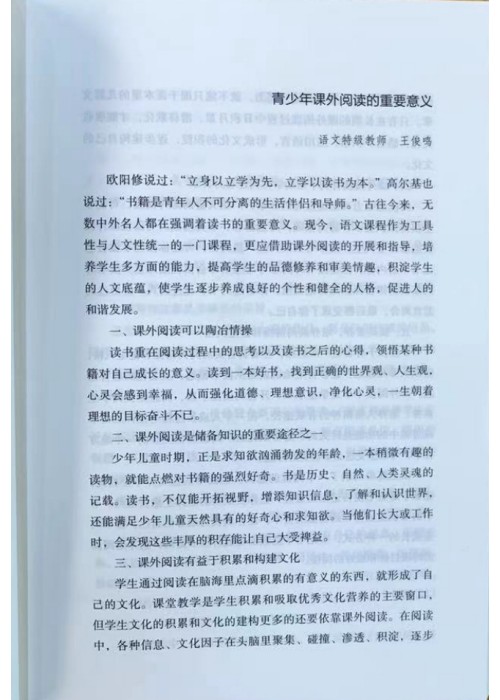 欧阳修说过:“立身以立学为先,立学以读书为本。”高尔基也说过:“书籍是青年人不可分离的生活伴侣和导师。”古往今来,无数中外名人都在强调着读书的重要意义。现今,语文课程作为工具性与人文性统一的一门课程,更应借助课外阅读的开展和指导,培养学生多方面的能力,提高学生的品德修养和审美情趣,积淀学生的人文底蕴,使学生逐步养成良好的个性和健全的人格,促进人的和谐发展。