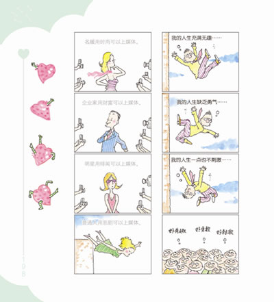 ★ 《大家都有病》全书分为六个板块:大家都有爱、大家都有玩、大家都有梦、大家都有错、大家都有钱、大家都有病。朱德庸首次在作品中引入“灰色”成分,画面冲击力极强,在一贯的“朱氏幽默”中,加入对现代社会及现代人生存现状的思考,在刻画种种病态的画笔下,流露出一种大悲悯情怀,呼吁现代人简单下来,慢下来,拥有属于自己的步调,享受属于自己的“慢时尚”。