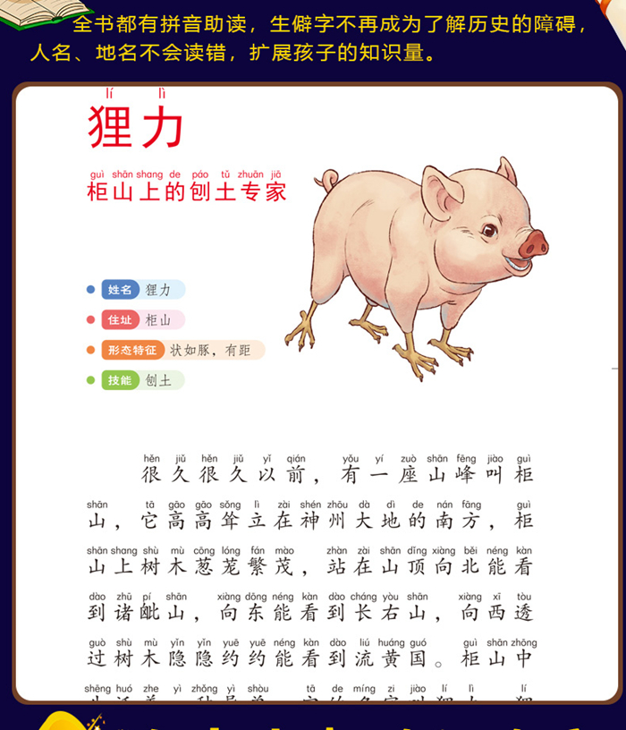 《山海经》是中国志怪书籍的开山鼻祖,黄帝大战蚩尤、后羿射日等远古神话传说都出自这本书。《给孩子的山海经》对原著的内容重新筛选和整理,改编成适合孩子阅读的故事,分为“人神篇”“异兽篇”“禽鸟篇”“鱼虫篇”,并 给每一个山神海怪绘制了精美插图,使得远古时期的瑰丽世界跃然纸上。在这套书中,你可以看到大地之母娲,刚毅顽强的猛士刑天,亦正亦邪的神兽九尾狐,歌颂太平的神鸟鸾鸟,大禹治水的好帮手旋龟...让我们一起仰人神、观异 兽、看禽鸟、赏鱼虫,在远古的山 海奇境里畅游吧!