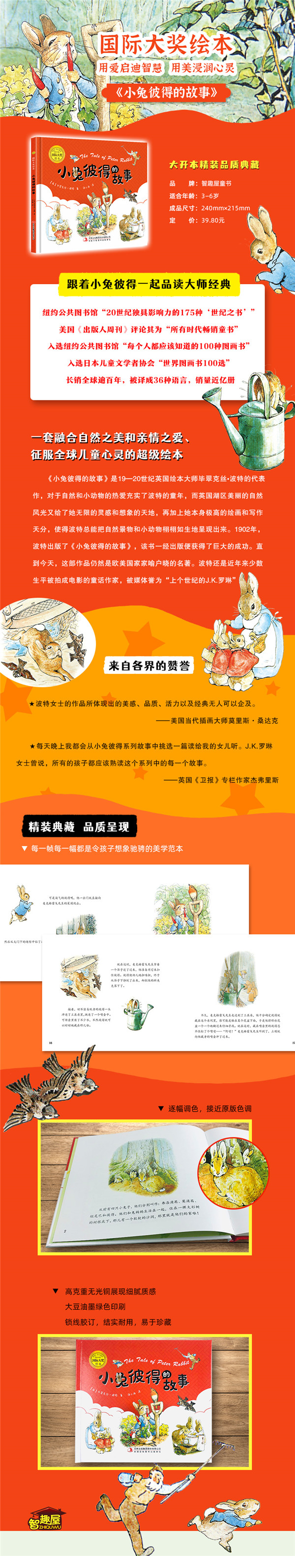 一辈子生活在庄园里的碧翠克丝·波特小姐为了安慰一个生病的小孩儿,编了一个小故事,并写在信里寄给他,这就是大名鼎鼎的《彼得兔的故事》。故事当中,彼得兔不听从妈指示,溜进了麦奎格先生的菜园,顽皮的彼得兔拼命地偷吃麦奎格所种的蔬菜。糟糕的是,彼得兔被发现了,所以他赶快逃跑。逃跑当中,彼得兔把他的蓝夹克和鞋子都弄丢了。很后,麦奎格用彼得兔留下的夹克与鞋子,做了一个稻草人放在菜园当中。故事内容丰富,充满童真童趣,也蕴含着深刻的人生哲理与智慧。