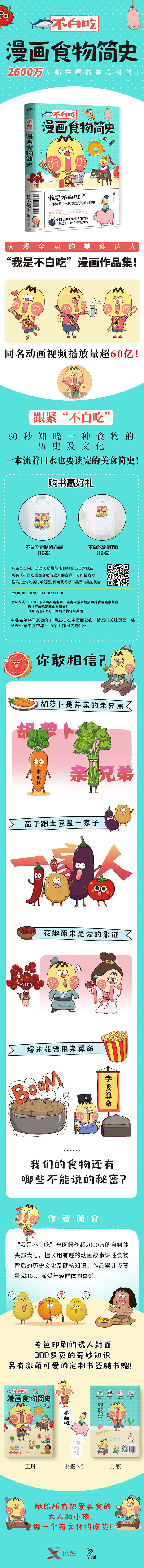 《不白吃漫画食物简史》是“我是不白吃”第YI部漫画科普书,用轻松幽默的漫画形式解读食物背后的起源发展、名人轶事等,贯穿生物学、植物学等百科知识,生动有趣的画面,严谨易懂的语言,帮助每一个吃货快速了解食物的文化历史。 连小说都不敢这样写的柑橘家族史;茄子和土豆竟然是一家;奇异果本生于中国;孔子收学费只收腊肉……各种关于常见食物的奇妙知识都能在这里找到答案。 打开本书,你将开启一场追寻食物秘密的科学探究,一场美食爱好者的文化趣谈!