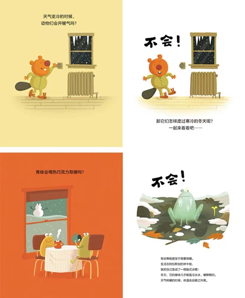 本书是一本适合低龄孩子阅读的轻科普绘本,以冬天动物们怎样取暖为主题,列举了十来种动物取暖的方式。比如青蛙,它会用降温的方式取暖一一林牛蛙还会把自己变成一根蛙式冰棍!这本书以一问一答的方式激发孩子的兴趣和思考。既有想象力,又有严谨的科学知识。非常适合学龄前宝宝和家长一起共读。另外,从画风上看,具有童趣的漫画风格,颜色亮丽,吸引低幼宝宝的注意力。同时,科普审校老师罗心字经验丰富,保证内容在语种转换过程中的准确性与易读性。