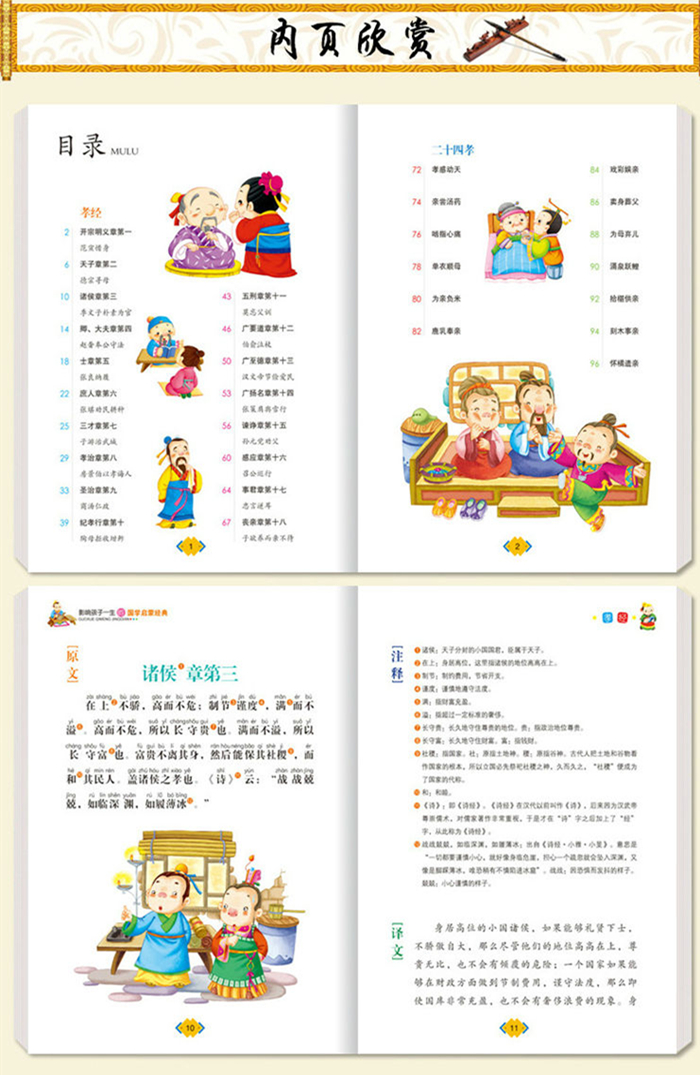 《孝经 二十四孝 影响孩子一生的国学启蒙经典(注音彩图版)》收录了《孝经)和《二十四孝>(末录其诗),另外附有清代王中书的《劝孝歌》。其中,《孝经》从“事亲”“事君”“立身”等角度,诠释了博大精深的孝道;《二十四孝》记录了历代二十四位孝子经久传诵的孝行故事。为了帮助小读者很好地理解原文,我们增加了精准的注释和简明的译文,还精选了许多与原文主题思想密切相关的生动小故事,并设置了“名师导读”“童心感悟’等栏目,结合原文及故事,提炼出一个个道理,启发小读者在阅读中思考。此外,我们还精心选配了大量精美的彩色插图,让孩子们能够轻松阅读。作为历史的产物,原作中的部分内容有一定的封建、迷信等色彩,需要读者以辩证的眼光来看待。