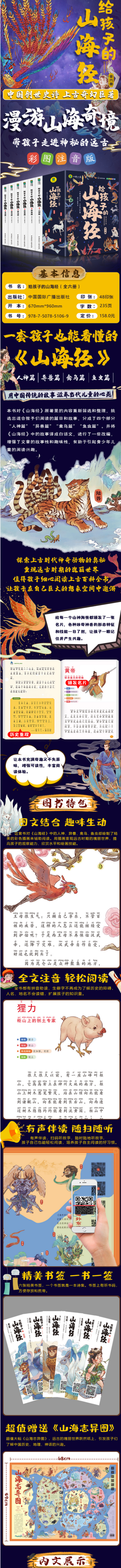 《山海经》是中国志怪书籍的 开山鼻祖,黄帝大战蚩尤、后羿射 日等远古神话传说都出自这本书。 《给孩子的山海经》对原著的内容 重新筛选和整理,改编成适合孩子 阅读的故事,分为“人神篇”“异 兽篇”“禽鸟篇”“鱼虫篇”,并 给每一个山神海怪绘制了精美插 图,使得远古时期的瑰丽世界跃然 纸上。在这套书中,你可以看到大 地之母女娲,刚毅顽强的猛士刑 天,亦正亦邪的神兽九尾狐,歌颂 太平的神鸟鸾鸟,大禹治水的好帮 手旋龟...让我们一起仰人神、观异 兽、看禽鸟、赏鱼虫,在远古的山 海奇境里畅游吧!