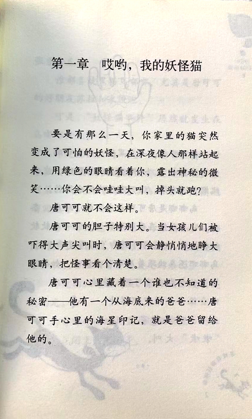 要是有那么一天,你家里的猫突然变成了可怕的妖怪,在深夜像人那样站起来,用绿色的眼睛看着你,露出神秘的微笑……你会不会哇哇大叫,掉头就跑? 唐可可就不会这样。.够 唐可可的胆子特别大。当女孩儿们被吓得大声尖叫时,唐可可会静悄悄地睁大眼睛,把怪事看个清楚。 唐可可心里藏着一个谁也不知道的秘密--他有一个从海底来的爸爸……唐可可手心里的海星印记,就是爸爸留给他的。