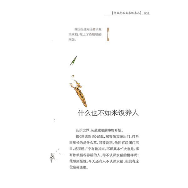 五谷以稻为贵。在孔子看来,“食夫稻,衣夫锦”(吃米饭、穿锦衣)就是难得的人生享受。 ——《什么也不如米饭养人》 早期中国人把小麦和大豆“粒食”,吃错了几千年。实际上,小麦磨成面粉, 发酵, 才变得甘美;大豆磨成浆、制作成豆腐,才成为经久不衰的美食。 ——《谁把豆子当饭吃》 华夏族对生姜怀有偏见。苏东坡吃了碗姜粥, 味道很美,他却突然感叹说: “无怪吾愚, 吾食姜多矣。”——难怪我笨,我姜吃太多了。 ——《圣人的姜食》 元末明初、葵菜被一种名叫菘(俗称白菜)的蔬菜取而代之。中国的蔬菜之王易主。 ——《痛失王冠之后》 处随塔称有史以来辣度最高的香料,在它面前,我国传统的花瓣,胡椒、生姜和茱萸,都黯然失色。 ——《人们为什么吃辣》