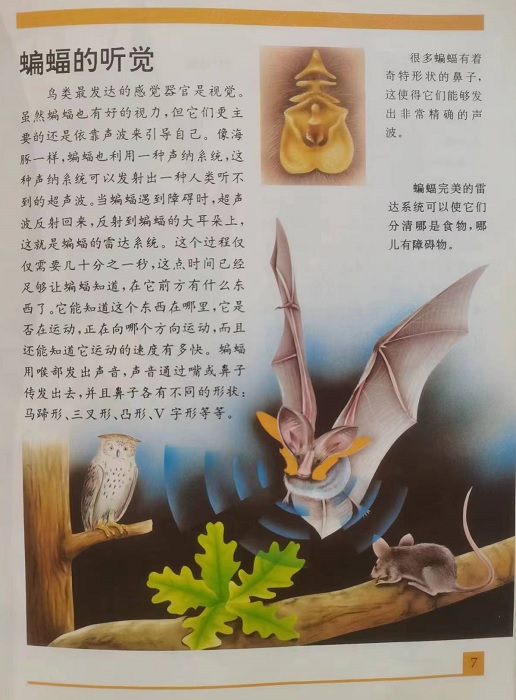 动物世界的奥秘 蝙蝠 发射超声波的动物 《动物世界的奥秘》由35集组成,叙述方法新颖、独特,为孩子们 展示了一个丰富多采的世界。孩子们可以在娱乐之中,探索动物世界 最诱人的奥秘:熊是怎样冬眠的?蝙蝠的雷达是怎样工作的?鸟是怎样 飞行的…… 这本由教育学家和动物学家共同为孩子们编写的《动物世界的奥 秘》,是一部具有很高欣赏价值的教科书,寓教于乐,孩子们可以从中 学到知识,得到乐趣。 蝙蝠 蝙蝠是一种利用声波来捕猎的 动物。要感谢蝙蝠的雷达系 统,给它在黑暗中引 导方向,避开障碍并 寻找食物。本书将告诉读者,蝙蝠是一 种唯一会飞的哺乳动物,还将揭示蝙蝠冬眠的秘密和 群居的生活方式。你会惊奇地认识到会捕鱼的蝙蝠,自 然也会了解到真正的吸血蝠。