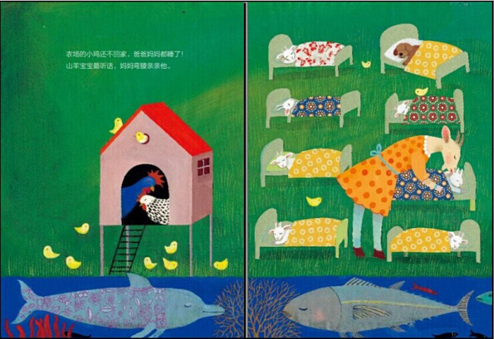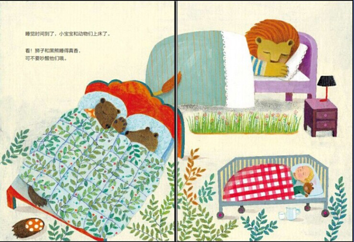 没有谁还在玩耍,只有各种睡梦中的动物们。小猴伴着黄香蕉睡着了,小老鼠陪着红苹果睡着了,连白天最凶猛的狮子鳄鱼,睡着以后都那么安静温柔,你甚至能听到他们轻轻的鼾声。