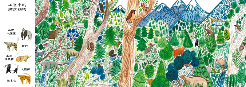 ★ 大幅对开手绘插画,10幅动物生态图景:每种场景中有形态各异的动物、植物,缤纷多彩,信息量丰富。