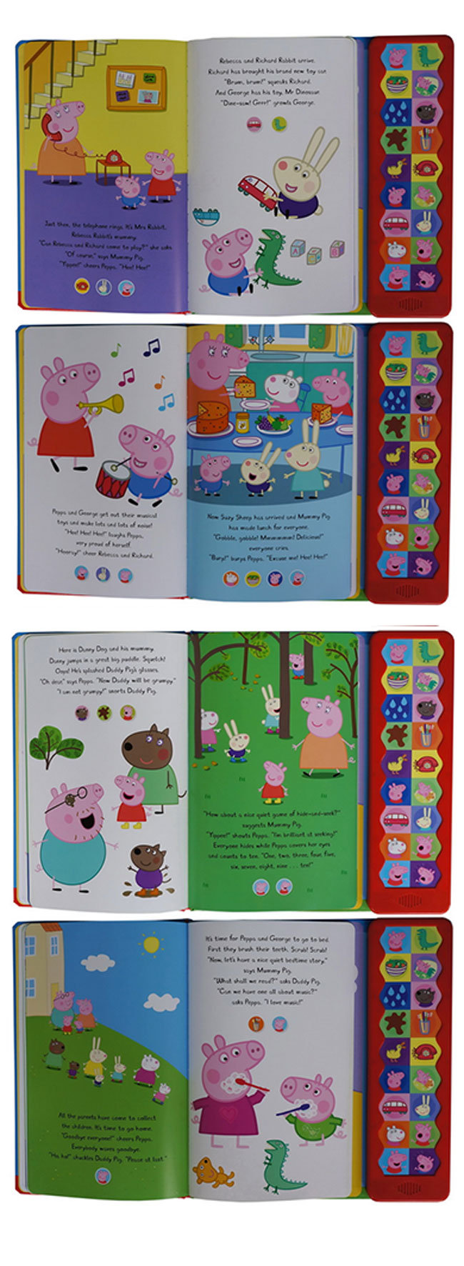 下雨了,佩佩和乔治只能待在家,好无聊…这时,电话响了,兔妈妈打来问Rebecca 和Richard可以到佩佩家一起玩吗?当然好啰!玩了一阵子后,雨停了,终于可以出去了,于是,大伙一起出门喂鸭子、玩躲猫猫。调皮的佩佩,冷不防捉弄乔治,惹得他放声大哭。原本安静的一天,变成充满笑声、玩乐声、哭声,有趣的一天。最后,为这一天画下句点的,是爸爸的床边故事读书声喔! (主题:音乐)共有18个音效按键,每页下方都有清楚的图示。