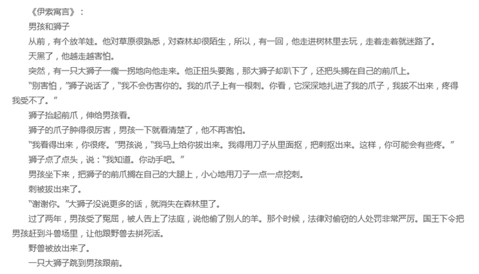 《伊索寓言》相传为公元前六世纪被释放的古希腊奴隶伊索所著的寓言集,并加入印度、阿拉伯及基督教故事,共357篇。《伊索寓言》中收录有三十多则寓言,内容大多与动物有关。书中讲述的故事简短精练,刻画出来的形象鲜明生动,每则故事都蕴含哲理,或揭露和批判社会矛盾,或抒发对人生的领悟,或总结日常生活经验。《伊索寓言》对后代欧洲寓言的创作产生了重大的影响,不仅是西方寓言文学的典范之作,也是世界上传播最多的经典作品之一。