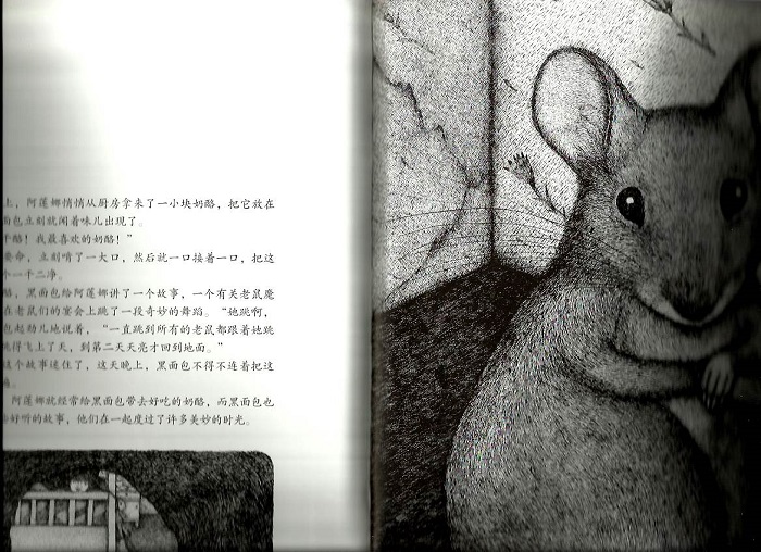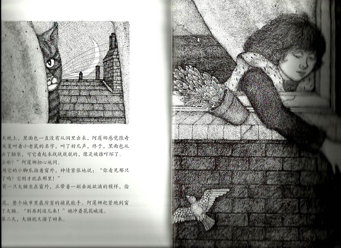 《阿莲娜、老鼠和巨猫》是一个典型的心理故事。对每一种新的东西由怕到不怕,其实都会有一次波浪形的心理震荡,这样的心理经历,是每个孩子都有的,并且有过无数次的。可是孩子不会总结,而大人早就忘了。现在,大家都得感谢这位充满想象力的铜版画家。 刘绪源