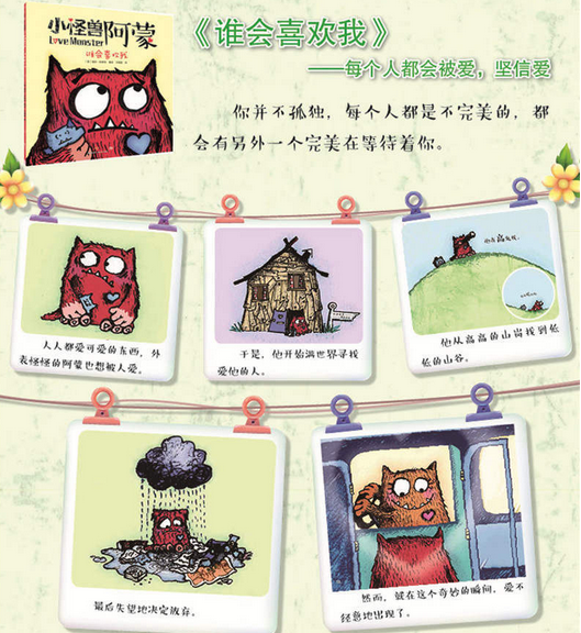 《小怪兽阿蒙:谁会喜欢我》——每个人都会被爱,坚信爱 人人都爱可爱的东西,外表怪怪的阿蒙也想被人爱。于是,他开始满世界寻找爱他的人。寻找爱的旅程有点儿不容易,他从高高的山岗找到低低的山谷,最后小怪兽阿蒙失望地决定放弃。然而,就在这个奇妙的瞬间,爱不经意地出现了。
