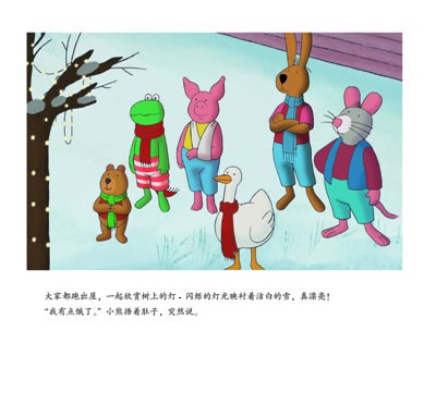 弗洛格、小熊、老鼠、鸭子和小猪一起听音乐玩抢凳子的游戏。小鸭开始就出局了,很不开心,可是后来发现,看着别人做游戏也是一件开心的事情。相信自己下一次会拿到第一名。