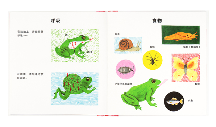 作为两栖动物,青蛙在水中和岸上用不同的方式呼吸。它有很多种食物可以吃: