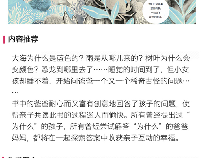大海为什么是蓝色的?雨是从哪儿来的?树叶为什么会变颜色?恐龙到哪里去了……睡觉的时间到了,但小女孩却睡不着,开始问爸爸一个又一个稀奇古怪的问题……