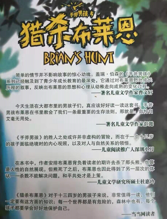 今天生活在大都市里的男孩子们,真应该好好读一读这套书。手斧男孩布莱恩在书里教会了我们一条重要的生存法则,那就是:自怜自艾毫无用处。